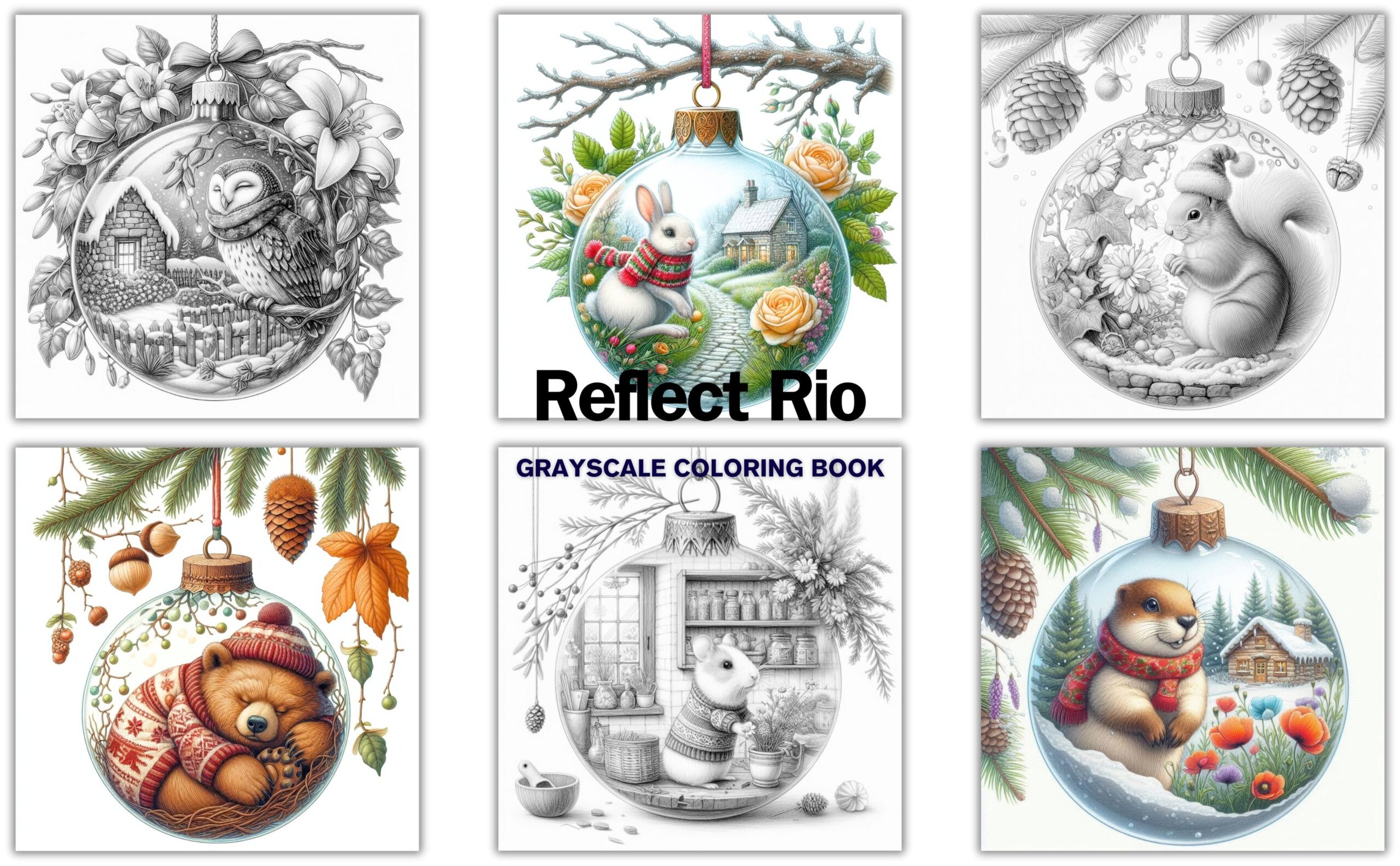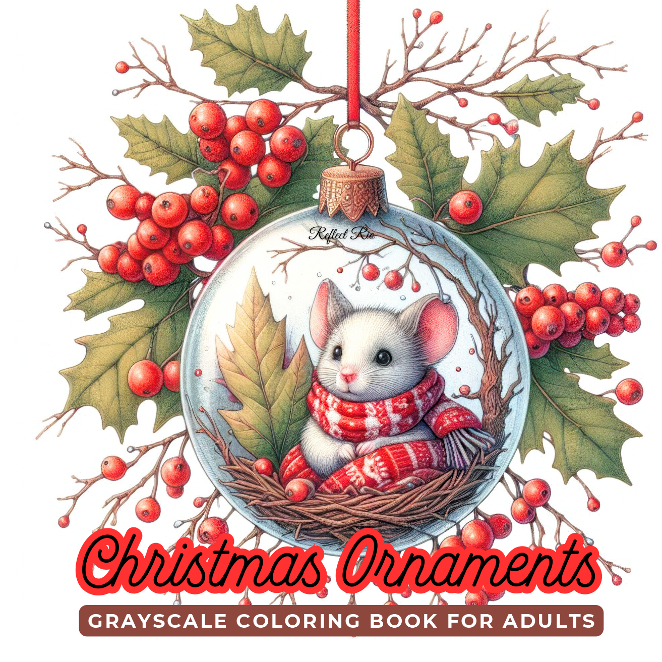 This enchanting grayscale coloring book features a delightful collection of festive illustrations, capturing the charm of Christmas through adorable animals dressed in holiday attire, cozy winter landscapes, and whimsical seasonal scenes—all beautifully nestled within intricately designed Christmas ornaments.