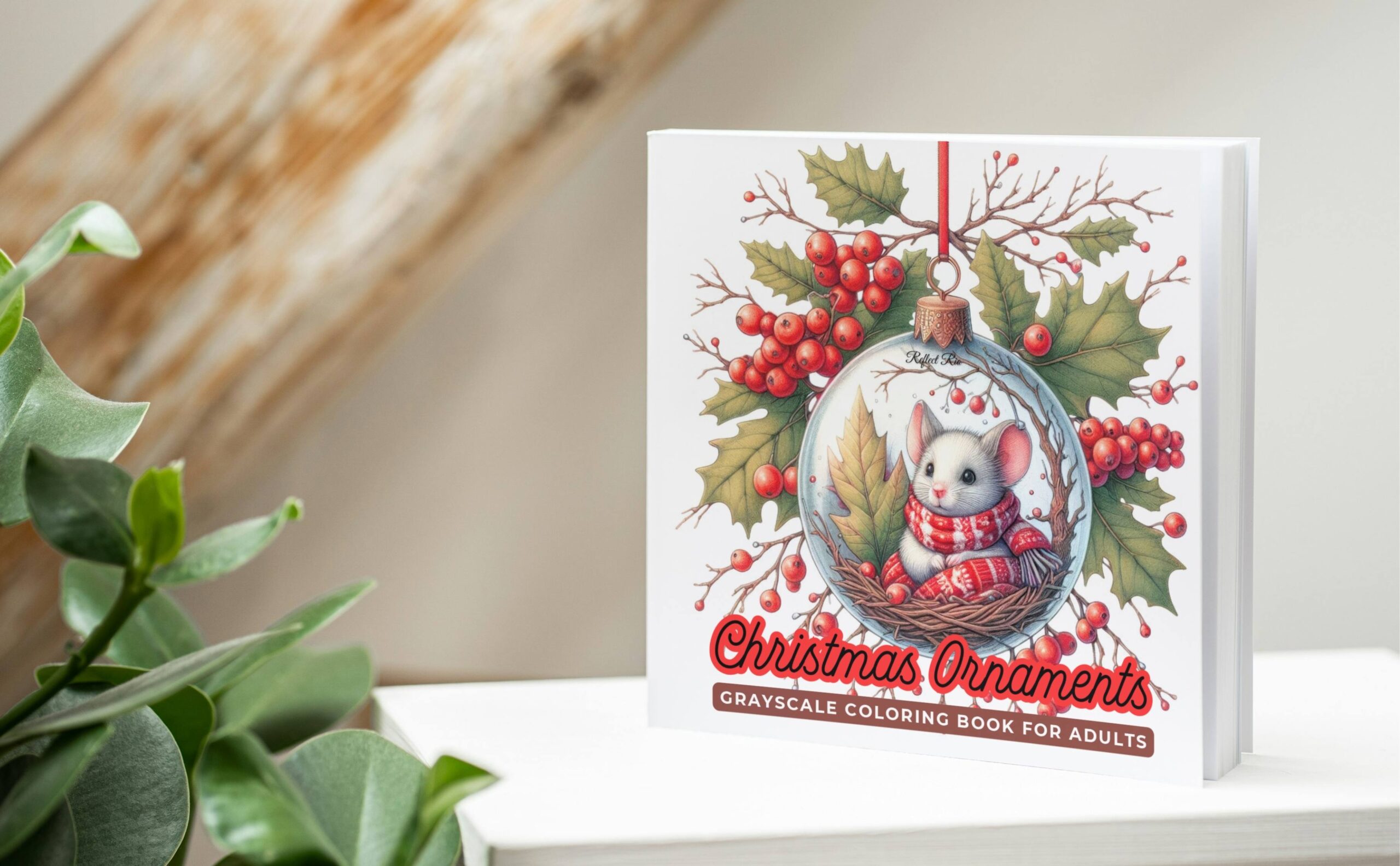 Product Description: “Christmas Ornaments Coloring Book: Festive Holiday Scenes and Adorable Animals in Christmas Ornaments” (Digital PDF)