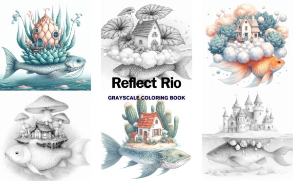 Embark on a magical journey with Fantasy Fish Homes, a mesmerizing grayscale coloring book where whimsical floating houses rest atop giant, mystical fish, surrounded by lush enchanted plants. This unique collection invites you into a dreamlike world where cozy cottages bloom among exotic flowers and fairy-tale mansions drift atop legendary sea creatures.