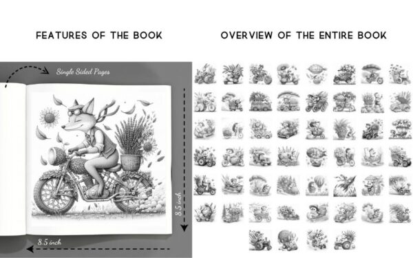 Whether you’re coloring a fluffy bunny steering a flower-petal car, a tiny mouse sailing in a fruit-boat, or a wise old owl cruising in a leaf-crafted motorbike, each scene is designed to spark joy and artistic expression. The soft shading of grayscale art helps create depth and dimension effortlessly, making it suitable for both beginners and experienced colorists.
