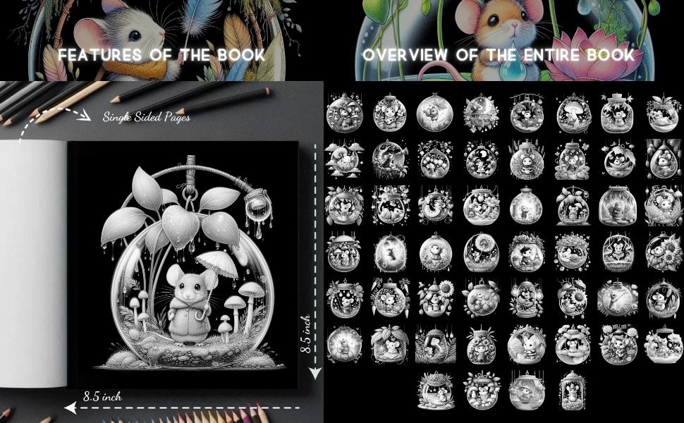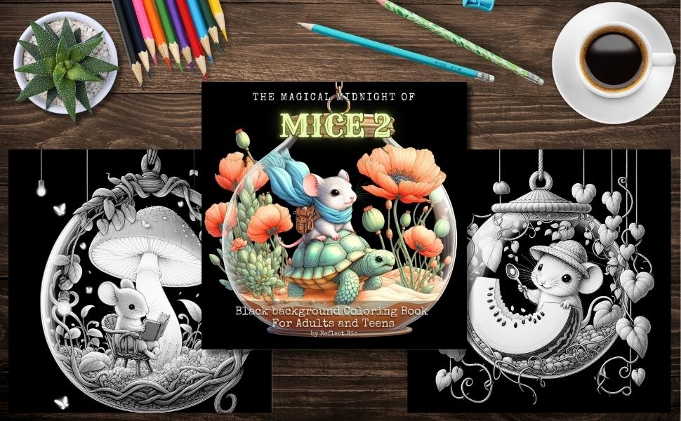 Embark on a magical journey with Magical Midnight Mice 2, the enchanting sequel to the beloved grayscale coloring book! This delightful collection invites you back into a whimsical world where tiny, brave mice become fearless explorers, adventuring through dreamy landscapes and magical terrariums—all set against a striking black background for maximum visual impact.