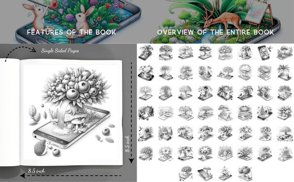 Each page invites you to explore breathtaking 3D landscapes, adorable animals, and surreal nature scenes that flow gracefully from glowing phone screens. Watch as lush forests spill from sleek devices, sparkling waterfalls cascade into the real world, and mythical creatures rest under blooming trees — all blending the magic of fantasy art with the modern charm of digital dreams.
